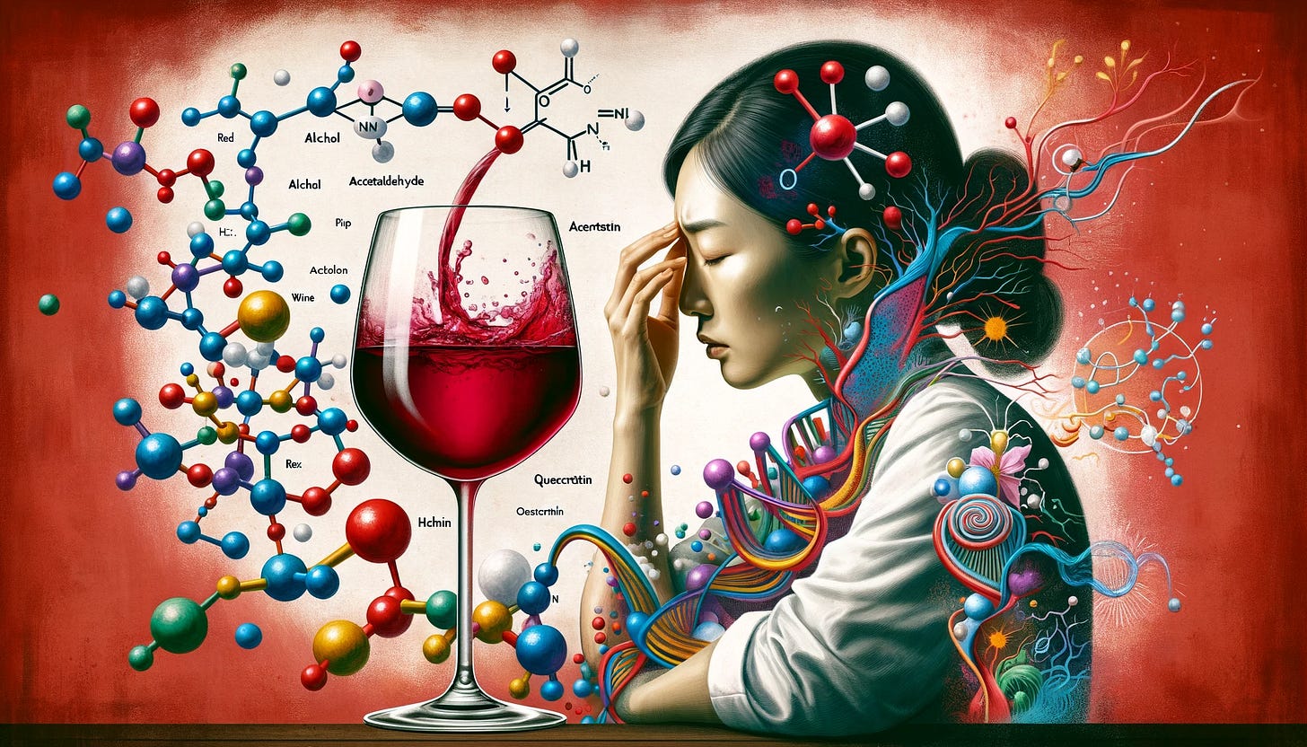 研究者發現,檞皮素的代謝產物,會讓酒精在代謝時產生更多的乙醛(acetaldehyde)堆積,惡化頭痛。再加上組織胺與單寧的加成,所以有些人喝了一些紅酒,就會引發頭痛。